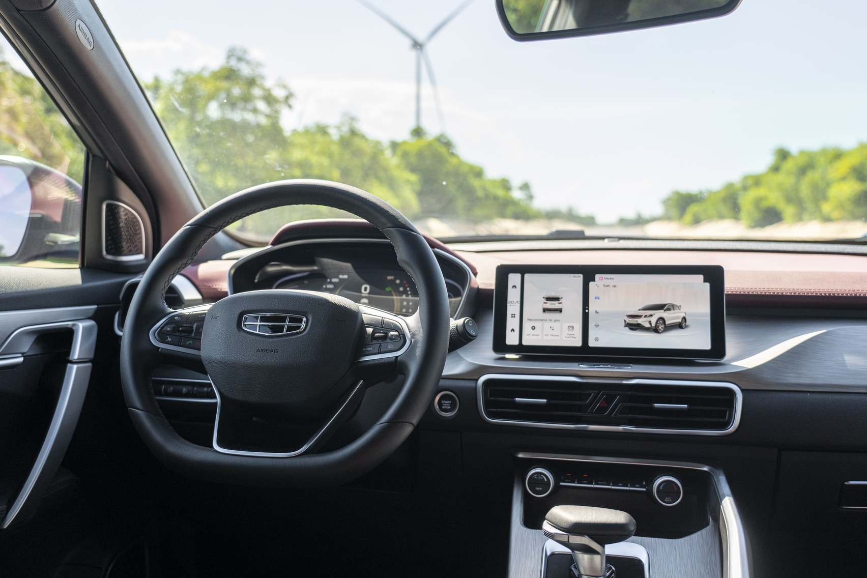 Geely Coolray không chỉ nổi bật với hiệu suất mạnh mẽ mà còn sở hữu một khoang nội thất sang trọng. Xe được trang bị màn hình kép 10.25 inch cho hệ thống giải trí và cụm đồng hồ, vô-lăng D-Cut thể thao, cùng ghế bọc da cao cấp và cửa sổ trời toàn cảnh, mang lại không gian thoải mái và tiện nghi. Ngoài ra, xe cũng hỗ trợ kết nối Apple CarPlay và Android Auto, giúp người lái dễ dàng kết nối và tận hưởng các tiện ích giải trí.